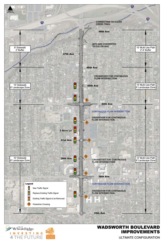Construction began in November 2021 to expand about one and a quarter mile of Wadsworth — also known as Colorado Highway 121 — to six lanes to handle traffic demands through 2040. New business vehicle entrances and exits were also built.