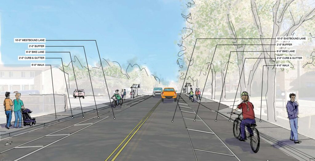 buffered bike lanes, curb and gutter and sidewalks on both sides of the street. ILLUSTRATION