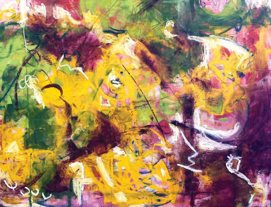 More recently, Carolyn’s work has been shaped by the devastating loss of her son.  While her art reflects that grief, she has been surprised to find that her color palette has become vibrant rather than dark.  In her piece Laughter From My Startled Mouth, for instance, bright yellows, reds, and greens dominate the canvas.